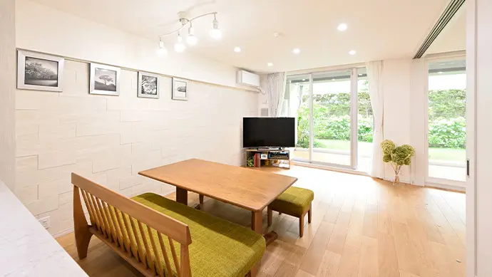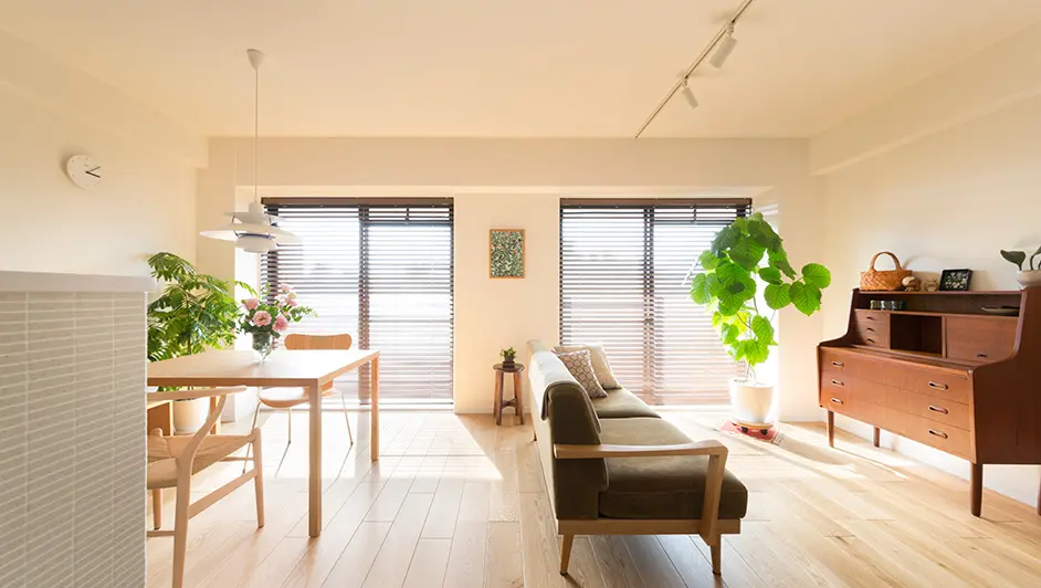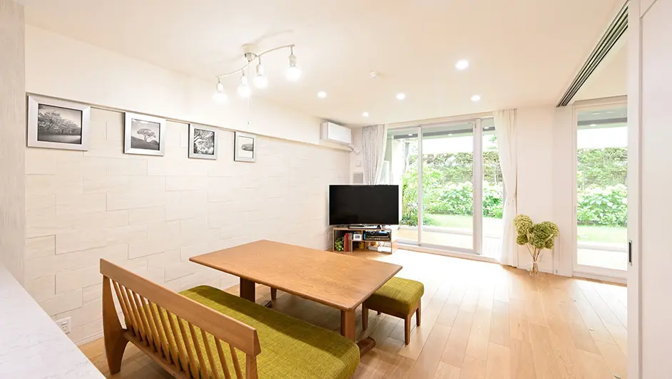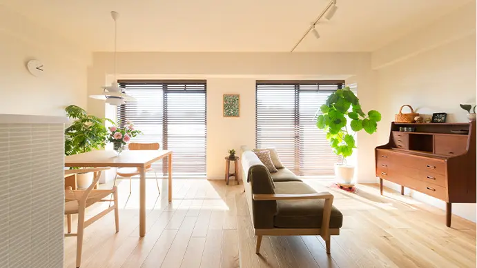 既存の部屋の間仕切りを取り払ってリビングを拡張します。隣接する和室を洋室に変えてリビングと一体化させて拡張することもできます。