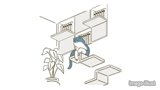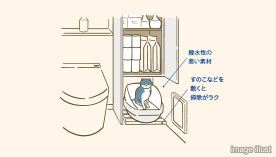 ねこちゃんは人の目につかない、静かなところで排泄したいもの。そこでねこちゃんのトイレを家族が使うトイレ内に設け、いつでも出入りできるペットドアをつけてはいかがでしょうか。消臭効果があったり、汚れがつきにくい素材を使ったり、ねこグッズを収納できるラックを備え付けると、さらに便利です。