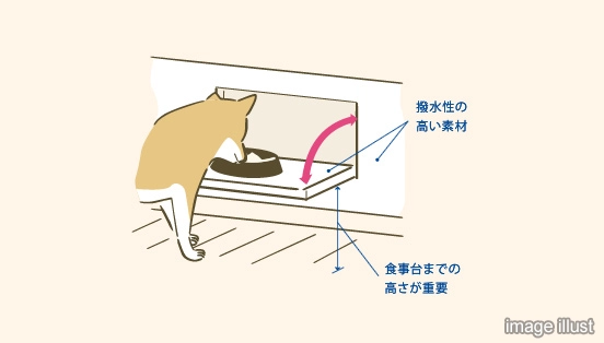 「食器を、わんちゃんの体の大きさに合った高さに置いてあげると、首が疲れず快適なんです!」そんな獣医師の意見から、少し高い所に固定できる食事台をご提案。使わないときは壁に収納できるタイプにすると、食事時間の習慣づけに役立ちます。また、メラミン素材なら拭きとりやすく、清潔に保てます。