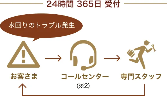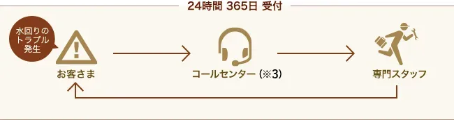弊社リフォーム工事箇所の水回り設備において、アフターサービス期間中※1にトラブルが発生した場合、24時間365日駆けつけ対応いたします。