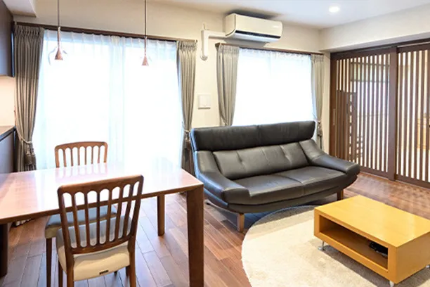 洋室(2)をなくしたことで、リビング・ダイニングが広がり、開放的な空間になりました。さらに、寝室や⽞関とつながる建具をガラス扉にしたことで、⼀体感のある洗練されたデザインに仕上がりました。スタイリッシュな仕上がりにとても満⾜しています。